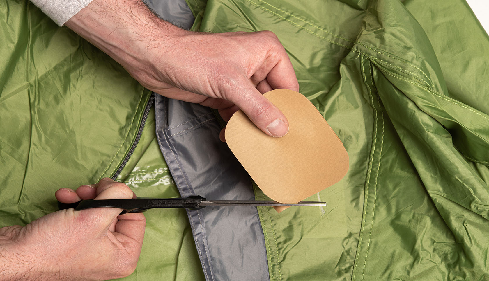 Let op: knip 2,5 cm extra materiaal langs alle randen van de scheur en zorg ervoor dat de hoekjes van het reparatiedoek afgerond zijn. Rechte hoekjes zijn namelijk kwetsbaarder voor beschadigingen of loslaten.