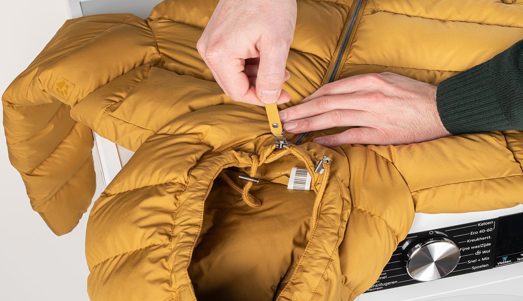 Let op: droog je jas alleen in de droger als de wasvoorschriften het toelaten.