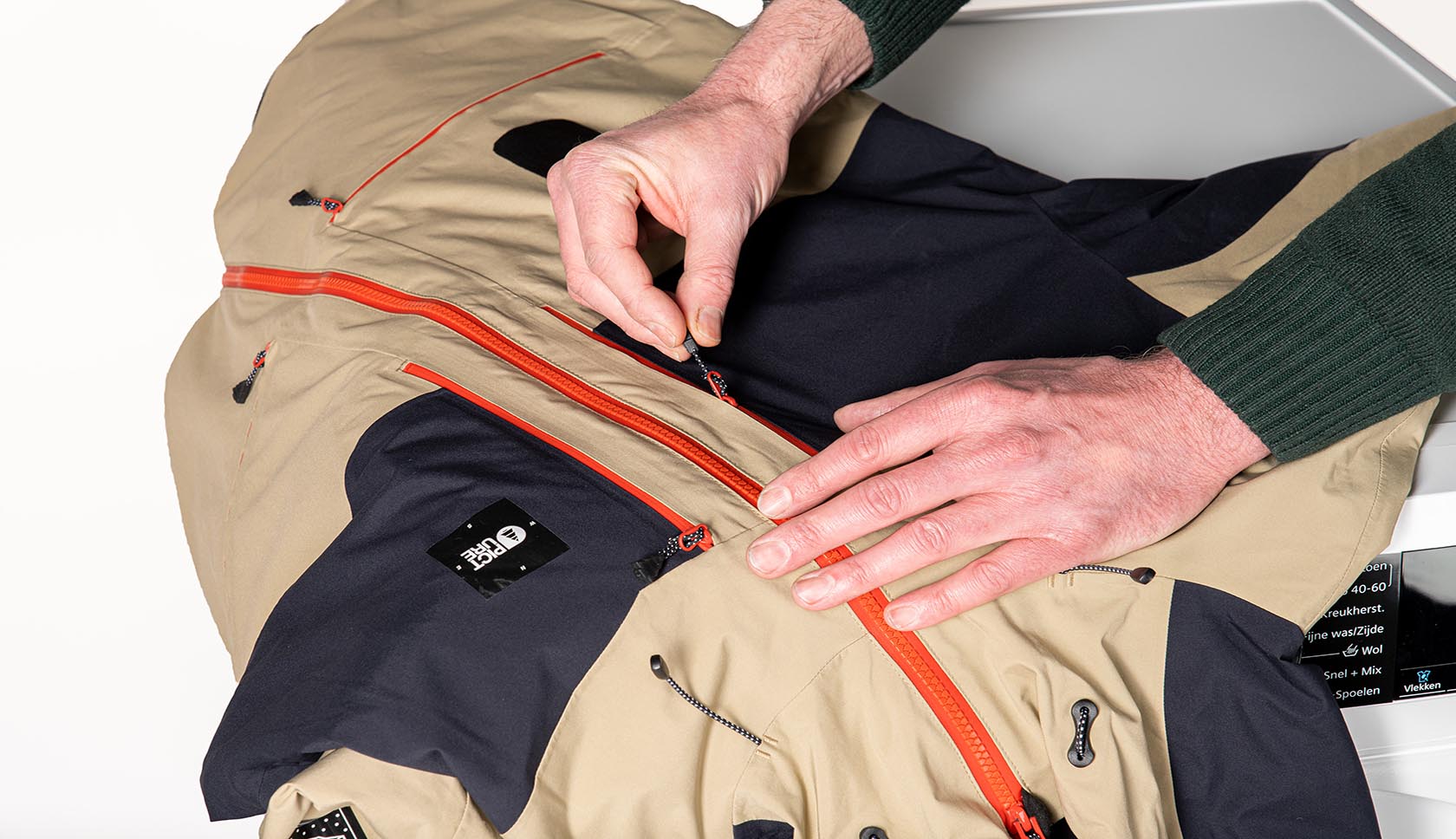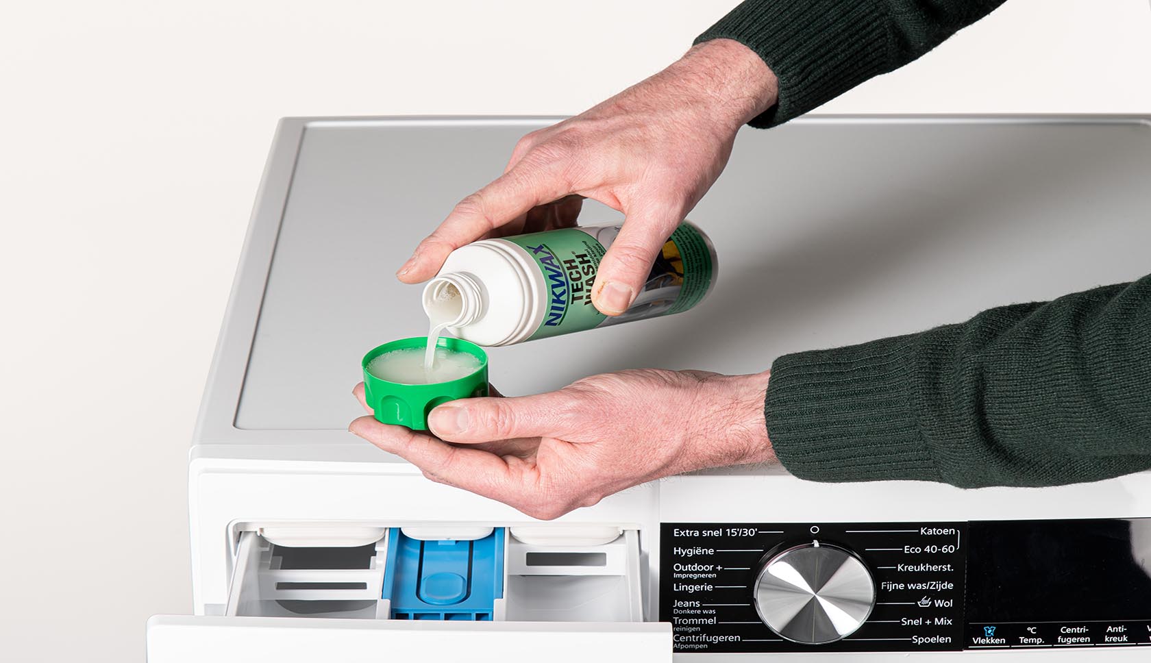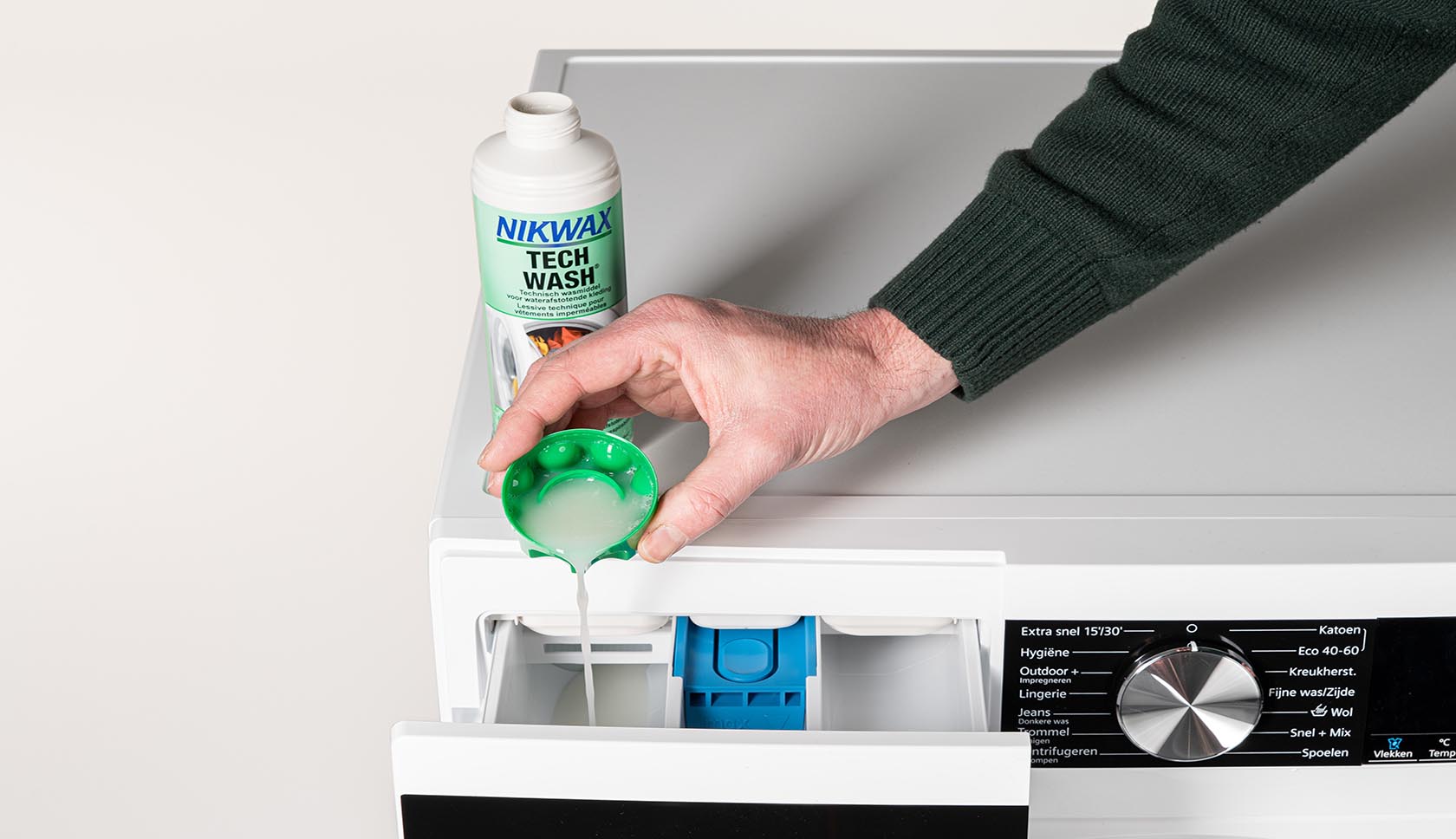 Een wash-in product doe je met je kleding in de wasmachine. Deze middelen doordringen de hele stof. Let hier wel op dat de binnenkant van je kledingstuk ook behandeld wordt, wat het ademend vermogen kan verminderen.